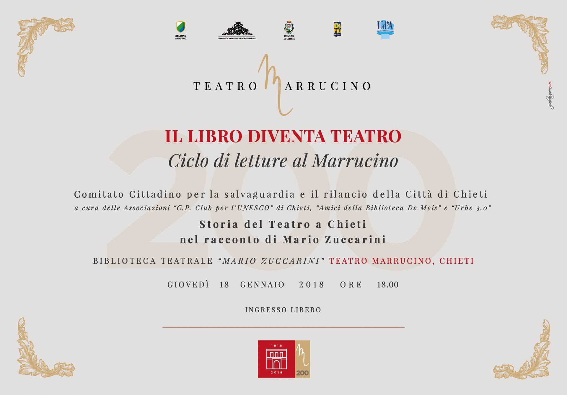 Giovedì 18 gennaio, alle ore 18.00, nella Biblioteca Teatrale “Mario Zuccarini” sita all’interno del Teatro Marrucino, il Comitato cittadino per la Salvaguardia e il rilancio della Città di Chieti presenta la lettura “Storia del Teatro a Chieti nel racconto di Mario Zuccarini”, a cura delle Associazioni “C.P. Club per l’UNESCO” di Chieti, “Amici della Biblioteca De Meis” e “Urbe 3.0”. L’ingresso è libero.