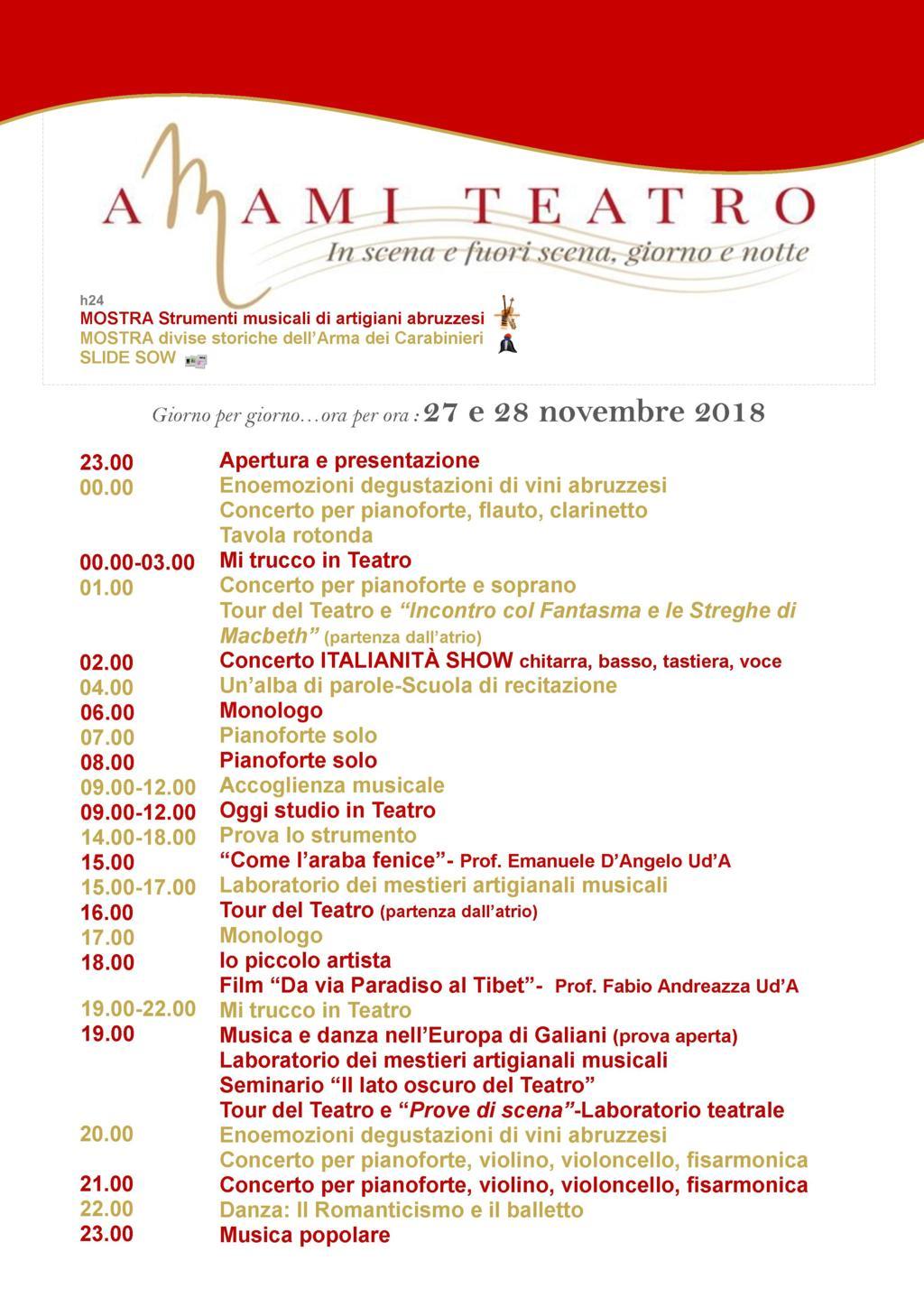 | Prende il via questa sera, alle ore 23.00, la manifestazione “Amami Teatro, in scena e fuori scena giorno e notte”. La Deputazione Teatrale Teatro Marrucino, in collaborazione con la Delegazione Fai di Chieti e la CNA Abruzzo, ha organizzato un progetto sperimentale innovativo, unico nel panorama teatrale nazionale e forse mondale, per la valorizzazione del patrimonio storico e culturale della Città di Chieti e dell’intera regione Abruzzo. Dal 27 novembre al 2 dicembre il Teatro rimarrà aperto ininterrottamente, di giorno e di notte per una vera e propria “maratona culturale” con proposte di musica, danza, storia, esibizioni, recitazione e la possibilità per il pubblico di partecipare a laboratori, prove, allestimenti, scelta di trucchi e letture di copioni, tutte ad ingresso libero e gratuito. I visitatori, con visite accompagnate anche nelle ore notturne, sul palcoscenico, nella buca dell’orchestra, nei camerini, nella biblioteca del teatro, in luoghi e meandri inaspettati, dove troveranno artisti, truccatori all’opera, tecnici al montaggio scene, avranno l’opportunità di vivere il teatro “dall’altra parte”, in una esperienza unica ed affascinante. Non mancheranno le iniziative per i più piccini che avranno la possibilità di provare liberamente e gratuitamente gli strumenti musicali al “Palcogiochi della musica” o di partecipare ad “Una domenica da favola” a cura dei piccoli allievi della scuola di recitazione del Teatro Marrucino, che animeranno fantastiche fiabe per i loro coetanei o, ancora, ascoltare le esibizioni musicali di giovani artisti in erba, nell’ambito degli appuntamenti “Io piccolo artista”. Durante tutto il corso dell’evento, in uno spazio esclusivo e di prestigio, trenta aziende artigianali tra le più rappresentative d’Abruzzo, esporranno strumenti e componenti musicali, realizzati da maestri artigiani, rari e ricercati, alcuni dei quali tipici della tradizione regionale abruzzese, con l’obiettivo di valorizzare le attività produttive presenti nel territorio. Accanto agli strumenti musicali, il Teatro ospiterà anche una preziosa mostra di divise dell’Arma dei Carabinieri dall’Ottocento al secondo dopoguerra.Di seguito si riporta il ricco programma della prima giornata |